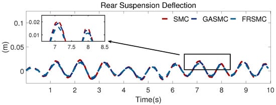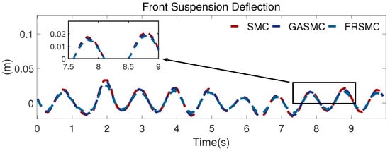 Figure 8 and Figure 9 show the simulation outcomes for the front and rear suspension deflection. The suspension deflection curves are close to one another in Figure 8 and Figure 9. However, we also find that the suspension deflection curves obtained with the FRSMC are smaller than those of the SMC and GASMC methods. These results show that the driving stability performance with the proposed controller is better than that obtained with the others.