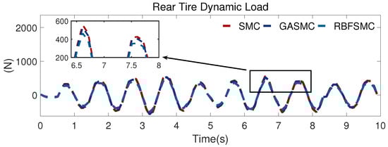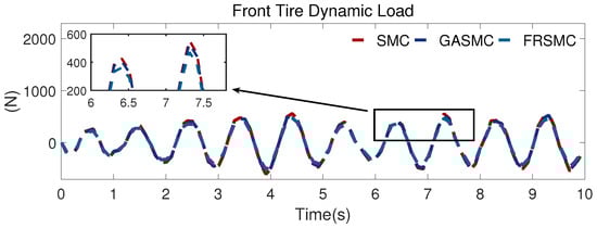 The results for the front- and rear-tire dynamic load are presented in Figure 10 and Figure 11. It is clear that, compared with that obtained with SMC and GASMC, the tire dynamic load curve is smoother with FRSMC. These simulation results also provide evidence that the control performance with the proposed controller is more remarkable.