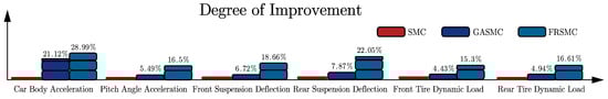 Table 1 shows the simulation results in terms of the RMS values and depicts a comparison among SMC, GASMC, and FRSMC. We also calculated the percentage by which the performance in terms of ride comfort and handling stability increased in comparison with the single sliding-mode control and genetic algorithm control methods. Figure 12 shows the degree of improvement. As can be seen in Table 1 and Figure 12, compared with that of SMC, the RMS value decreased by 21.12% and 28.99% with GASMC and FRSMC. For the pitch angle acceleration, the RMS value decreased by 5.49% and 16.5% with GASMC and FRSMC in comparison with SMC. With the proposed controller, the front and rear suspension deflection improved by 18.66% and 22.05%, respectively, which is better than the control effect obtained with GASMC. For the tire dynamic load, we also find that the RMS value declines by 15.3% and 16.61%, respectively, in comparison with that of the SMC.
