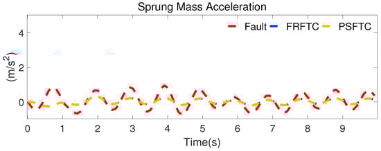 Figure 13 demonstrates the car body mass acceleration with a nonlinear suspension in the environment of actuator faults with fault-tolerant PSFTC and the designed fault-tolerant controller. It can be seen in Figure 13 that the proposed FRFTC leads to a smaller car body acceleration than that obtained under the fault conditions and with the PSFTC strategy, which means that the vertical motion of the car body provides better ride comfort when using the fault-tolerant FRFTC.