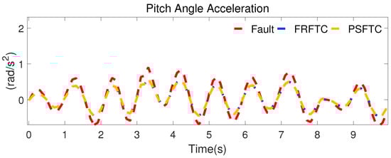 Figure 14 indicates the pitch angle acceleration in the case of actuator fault and with the PSFTC and FRFTC. We can see in Figure 14 that the pitch angle acceleration can be suppressed to a smaller amplitude with the proposed FRFTC method than with the actuator fault; thus, it is implied that the driving stability of the proposed fault-tolerant controller is superior when maintaining the suspension performance when an actuator failure occurs.