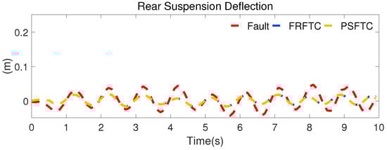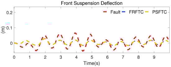 Figure 15 and Figure 16 show the front and rear suspension deflection in the simulation outcomes. It can be seen in Figure 15 and Figure 16 that the suspension deflection curves with the FRFTC are smaller than those in the fault case and the PSFTC method. These results show that the driving stability performance with the proposed controller is better than that with the PSFTC, and the controller is able to bring the fault suspension close to the regular state.