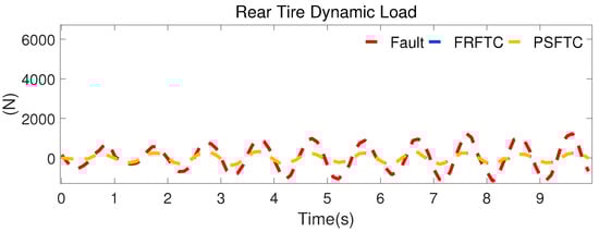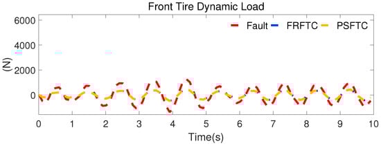 The results of the front- and rear-tire dynamic load are shown in Figure 17 and Figure 18. It is clear that, compared with the fault case, both the PSFTC and FRFTC can improve the suspension performance. However, the control effect of the FRFTC is better. These simulation results also provide evidence that the control performance of the proposed fault-tolerant controller is more remarkable.