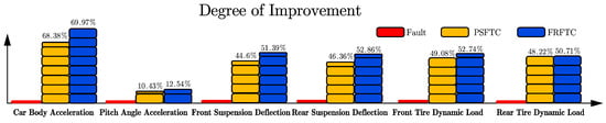 Table 3 shows the simulation results in terms of the RMS values in a comparison among faults, the PSFTC, and the FRFTC. Figure 19 shows the degree of improvement. As can be seen in Table 3 and Figure 19, it is easily noted that, compared with the actuator fault case, the RMS values decreased by 68.38% and 69.97% with the GASMC and FRSMC. For the pitch angle acceleration, the RMS values decreased by 10.43% and 12.54% with the PSFTC and FRFTC in comparison with the fault case. With the proposed controller, the front and rear suspension deflection improved by 51.39% and 52.86%, respectively, which is better than the control effect with the PSFTC. For the tire dynamic load, we also find that the RMS values declined by 52.74% and 50.71%, respectively, compared with those in the fault case.