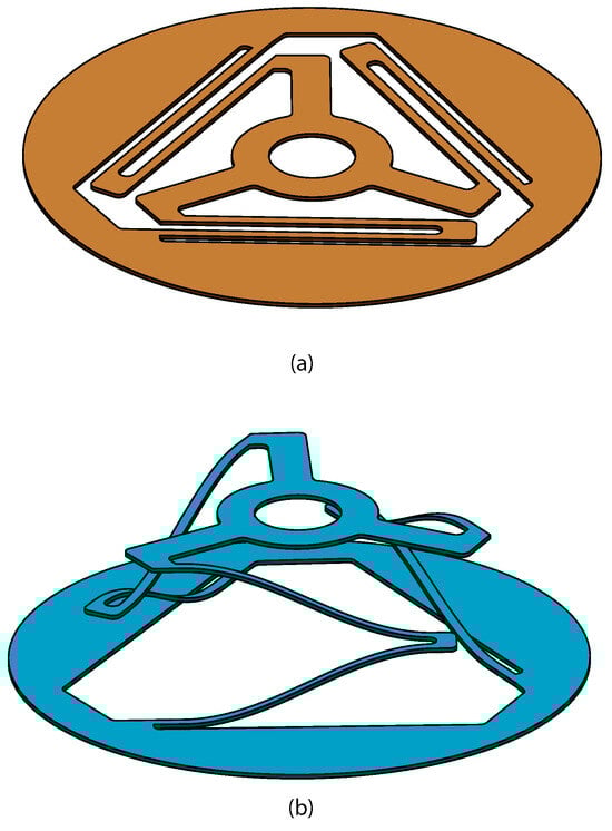 One such complaint mechanism is the compliant orthoplanar spring [19], shown in Figure 1a. These mechanisms usually consist of an outer rigid portion (or ring) and an inner rigid portion (or ring) connected by compliant legs that allow for out-of-plane deformation, while other orthoplanar springs existed before, the mechanism presented in Ref. [19] allows for deployment orthogonal to the plane without rotation about the central axis during motion. The compliant orthoplanar spring has been used in designs for several applications, including mechanical vibration energy harvesting [21], piezoelectric energy harvesting [22,23,24,25,26], force sensing [27,28,29], and uniformly and dynamically spacing a dielectric beam-scanning prism [30]. Ref. [19] also provides nomenclature to define the number of legs, compliant flexures, and orientation of the legs. Other research has sought to more fully define the mechanical behavior of the compliant orthoplanar spring [31,32,33].