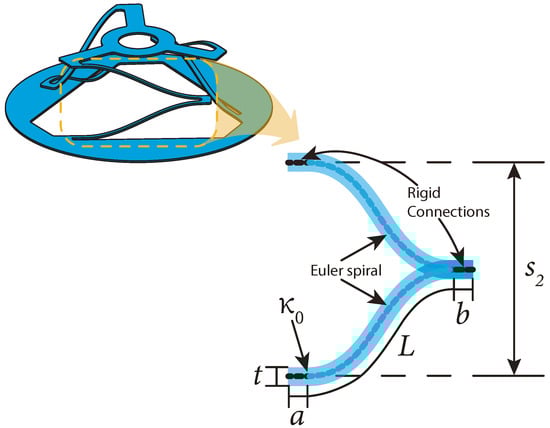 An Euler spiral is a curve whose curvature is linearly proportional to its arc length [34]. This characteristic allows the arc to assume a flat configuration under a load while storing strain energy. This makes it useful for areas that need smooth transitions, such as in parallel continuum robots [35], reducing the shaking of sliding doors through optimization [36], and in path tracking for autonomous vehicles [37]. The Euler spiral has also been used in antenna design as a nanoantenna for a solar cell [38] and can be found in nature in mammalian whisker shapes [39,40]. Yellowhorse and Howell [41] proposed using an Euler-spiral-based compliant flexure as a lenticular stiffener for deployable systems. Ynchausti et al. [18] used an anti-symmetric Euler spiral to create a flexure that lies flat underneath a load and can be connected between two rigid panels, known as deployable Euler-spiral connectors. See Figure 2a for the uncompressed Euler-spiral flexure connected between two rigid panels and Figure 2b to see it compressed (in the flat state).