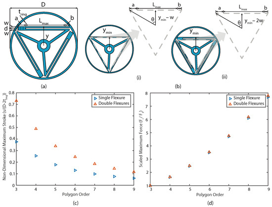 (a) Dimensions of the orthoplanar spring to determine the largest length of Euler-spiral flexure that can be used for a given distance from the center of the orthoplanar spring. (b) The minimum distance the legs of the orthoplanar spring can be placed in the ring for a single (i) and double (ii) series flexure. (c) The non-dimensional stroke of the single and double flexures based on polygon order. (d) The scaled force of the single and double flexures based on polygon order. The base force was determined to be the maximum force of a tri-leg orthoplanar spring. In both (c,d), .