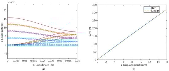 (a) The Euler-spiral in the initial shape (solid line), three intermediate positions (orange, purple, and light blue), and the final shape (dark blue) under 5 different forces from zero to . (b) The force-deflection curve for the DESC in part (a). A boundary value problem (BVP) solution from [18] was used for the solid curve. The linear stiffness (dashed line) was determined from a linear slope of the final force and deflection. The parameters of this Euler spiral are rad/m, GPa, MPa, mm, mm, and mm.