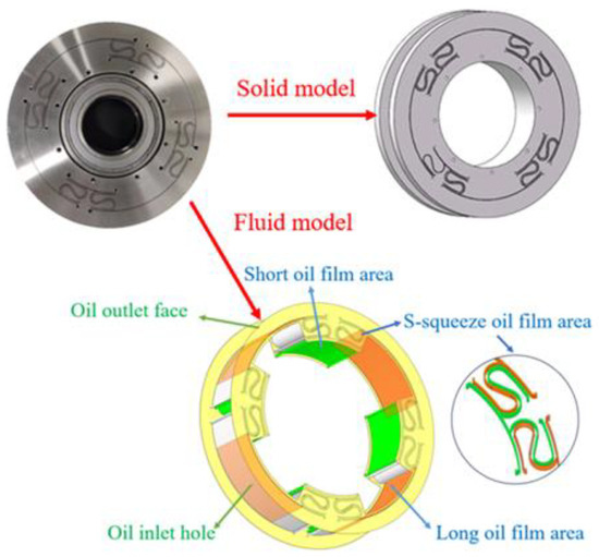Figure 3, the squeeze oil film area of ISFD can be divided into long-squeeze oil film area, short squeeze oil film area, and S-type squeeze oil film area. The flow situation of the oil film area of ISFD is as follows: (1) the lubricant is injected into the squeeze oil film area through the inlet hole; (2) the lubricant flows through the long-squeeze oil film area, the S-type squeeze oil film area, and the short squeeze oil film area; and (3) the lubricant is finally flowed out by the outlet end face. The inner wall of the oil film is in contact with the outside of the inner ring of the ISFD, and the outer wall of the oil film is in contact with the inside of the outer ring of the ISFD. The motion state of the inner wall of the oil film is consistent with that of the inner ring of the ISFD, and the motion state of the outer wall of the oil film is consistent with that of the outer ring of the ISFD.