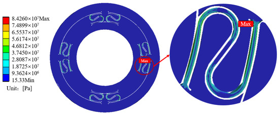 The safety coefficient = 1.5 is chosen, and calculation yields the allowable stress as [] = 1.3667 × 108 Pa according to Equation (11). The maximum stress of ISFD is less than the permissible stress ([] = 1.3667 × 108 Pa), which satisfies the requirements of the strength design and guarantees that the material will not be damaged due to excessive stress.