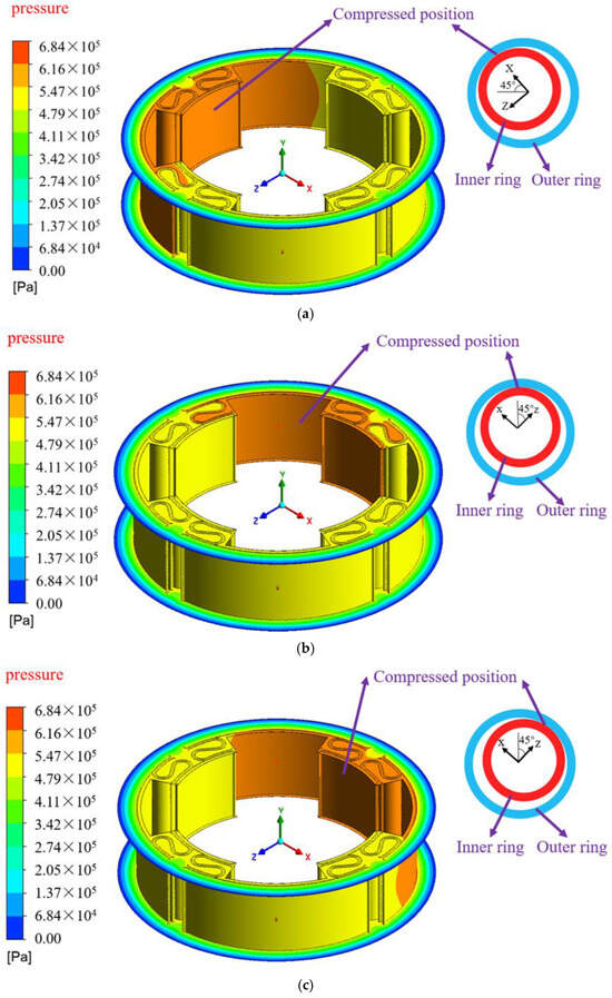 It can be seen that the magnitude of the fluid pressure in the region of the squeeze oil film in the ISFD at different moments varies with the position of the movement of the inner ring of the ISFD, and the fluid pressure in the squeezed area is significantly higher than that in the unsqueezed area. In addition, the lubricant is injected through the inlet hole and enters the long-squeezed oil film area. Due to the relatively large space of the long-squeezed oil film area, the fluid pressure becomes smaller after the lubricant enters, so the pressure at the oil inlet hole is significantly higher than the pressure at the long-squeezed oil film area.