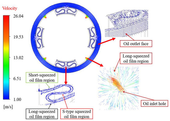 Figure 9 shows that the lubricant flows from the inlet hole into the long-squeezed oil film area at a high rate. Since the area of the long-squeezed film zone is much larger than the cross-sectional area of the inlet hole, the flow rate of the lubricant decreases significantly after flowing into the long-squeezed film zone. The lower part of