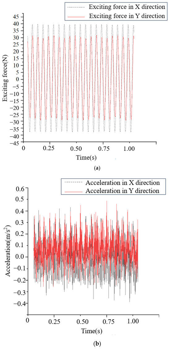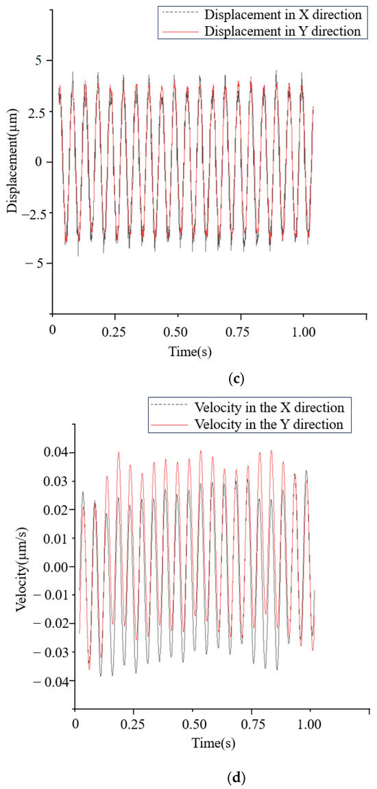 The specific experimental process is as follows: In order for the stationary sleeve and the ISFD to perform vortex motion together, the computer operates the data collector. The signal generator produces sinusoidal signals, which are then amplified by the power amplifier and used to drive the “X” and “Y” direction shaker. At the same time, the impedance head sensor and displacement sensor measure the excitation force, acceleration, and displacement of the ISFD, respectively. The data collector records, saves, and analyzes the measured data. From the measured data, the stiffness coefficient and damping coefficient of the ISFD can be calculated, which is the required solution for the experiment.