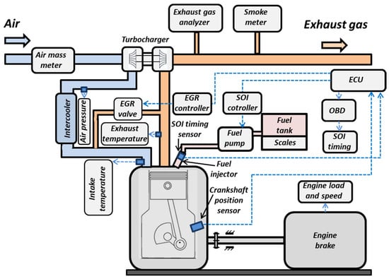 The engine control unit (ECU) controls the exhaust gas recirculation (EGR) system on the engine. During the test, the EGR system is disconnected from the ECU and controlled by a separate controller, which allows the EGR influence to be studied over a wide range. Similarly, the effect of the start of injection (SOI) on engine performance was investigated by disconnecting the control of the fuel injectors from the ECU and by using a separate controller to adjust the SOI. The actual SOI value is determined using a specialized VW-Audi diagnostic tool VCDS [], which is connected to the on-board diagnostics (OBD) connector on the ECU. SOI units are crank angle degree before top dead centre (CAD bTDC), with a measurement accuracy of 0.5 CAD. A scheme of engine test equipment is shown in Figure 1.