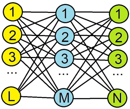 An artificial neural network is a basic network consisting of an input layer, an output layer, and one or more intermediate neuron layers []. The main advantage of this network is that it evaluates input patterns after training []. For such a network, supervised learning can be organized based on examples where input and output are linked by an event, or, in other words, a cause forms an effect (for example, experimental results of physical phenomena or function values obtained by an unknown formula, etc.). The essence of ANN training is that the desired output can be produced within a given error tolerance.