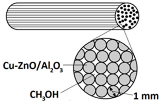 Cu-ZnO/Al2O3 was used as a catalyst in the reactor (Figure 3). The reactor, with an internal diameter of 16 mm and a length of 520 mm, was filled with aluminium rods with a diameter of 1 mm and with a catalyst of copper and zinc oxide deposited on them.