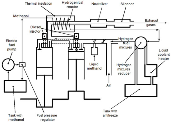 A scheme of the stand based on the diesel/hydrogen engine D21 for the research of its work to products of alternative hydrogen fuel mixtures is shown in Figure 4.