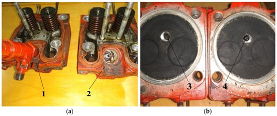 Diesel fuel to hydrogen gas mixture converted heads of the block: (a) View from the timing valves heads block; (b) view from the side of the combustion chamber heads. 1—the head of the engine before re-equipment with the established diesel fuel injector; 2—the head of the engine after re-equipment with the established high-voltage plug and the dismantled fuel injector; 3—high-voltage plug; 4—diesel fuel injector.