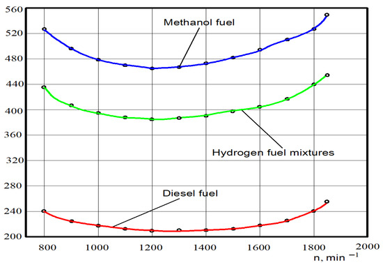 The experiments showed that the fuel-economy indicators during the engine run with a catalytic reactor on a hydrogen mixture at all the modes of engine crankshaft rotation frequency were higher (on average by 15–21%) than when the engine operated on pure methanol without a hydrogen reactor. At the same time, at low crankshaft rotation frequencies (800 to 1000 min−1), the specific fuel consumption when the engine was running on a hydrogen mixture with a catalytic reactor differed less than the specific fuel consumption when the engine was running on pure methanol. This is obviously explained by the relatively low temperature levels of exhaust gases when the engine is operating at low loads, which is in good agreement with the work of [39]. The low temperatures of the exhaust gases, in turn, lead to a somewhat lower productivity of the reactor in terms of hydrogen output.