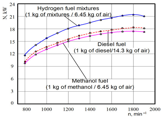 The experiments confirmed that the engine power, depending on the frequency of rotation of the crankshaft and the engine load, increased by 10–14% on the hydrogen mixture compared to the operation of the experimental engine on diesel fuel.