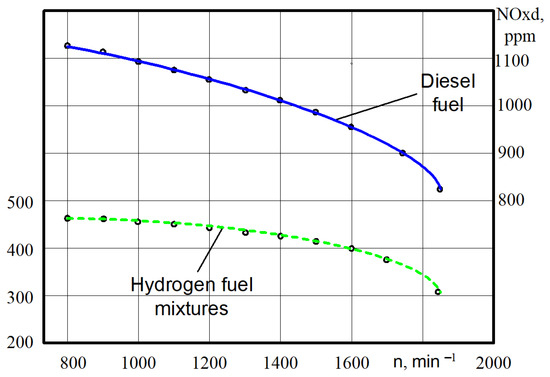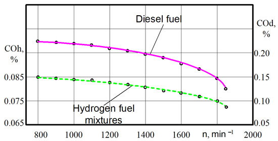 Thus, at the crankshaft rotation n = 790–810 min−1, the carbon monoxide decreased from 0.228% when the engine was on diesel to 0.085% when the engine was running on the hydrogen fuel mixtures. At crankshaft rotation n = 1840–1860 min−1, the carbon monoxide decreased from 0.122% when the engine was on diesel to 0.072% when the engine wa on hydrogen fuel mixtures. The decrease in CO content occurs in the range of 51.6–61.8%.