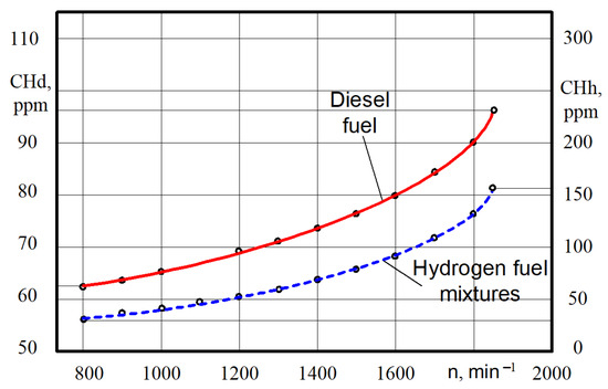 Thus, at the crankshaft rotation n = 790–810 min−1, the CnHm content varies from 62 ppm when the engine is on diesel to 32 ppm when the engine is on hydrogen fuel mixtures. That is, the decrease in CnHm content was 30 ppm. At crankshaft rotation n = 1840–1860 min−1, the CnHm content increases from 96 pm when the engine is on diesel to 155 ppm when the engine is on hydrogen fuel mixtures. That is, the increase in hydrocarbons was 1.6 times greater.