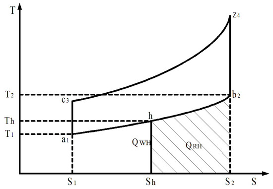 Thermodynamic cycle for engines converted to gaseous products of hydrogen with heat regeneration. S1-c3-z4-S2—the supplied heat QSH; S1-a1-b2-S2—the waste heat QWH; Sh-h-b2-S2—the heat for regeneration QRH.