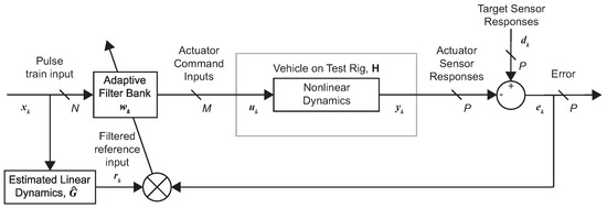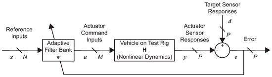 For MIMO ANVC applications, the signal in Figure 1 represents a primary disturbance noise and/or vibration field measured by P sensors, and the signal represents the secondary noise and/or vibration field created by M control actuators to cancel the disturbance. The symbol in Figure 1 represents a bank of dynamic filters, typically Finite Impulse Response (FIR) filters, whose coefficients are updated in response to the measured error signals. The signal represents a set of N reference inputs, which, for ANVC applications, must be mutually independent and highly correlated to the primary disturbance [26,27]. The signal contains the outputs from the bank of adaptive filters in response to the inputs . Note that if the reference inputs are chosen to be the target sensor responses where , or a time-advanced version of them, , then the converged filter bank represents an approximation to the dynamic pseudo-inverse of the nonlinear system [11,12,23,27].