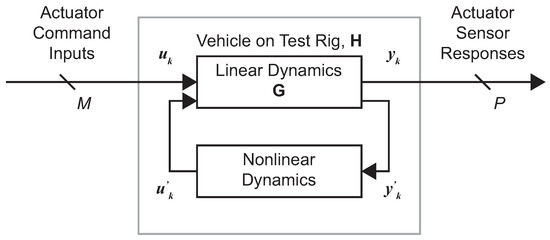 The nonlinear time-invariant dynamics of the vehicle on the test rig are given by the symbol in the previous block diagrams. The nonlinear model can be represented as a set of linear dynamics interconnected with a nonlinear feedback path, as indicated in Figure 3. The representation in Figure 3 reflects the common engineering practice and desire to develop linear models of the nonlinear system while still acknowledging the fact that nonlinearities are present in the dynamics. Notice that the block diagram structure in Figure 3 is actually a generalization of the Lur’e problem described in Vidyasagar [31].