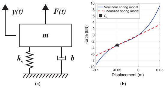Illustration of suspension model used in simulation and the constitutive relationship of nonlinear spring. (a) A simple primary suspension model used for simulation with one input and one output response . (b) Spring force diagram showing the cubic nonlinear spring characteristic and the linearized spring model at the binding point .