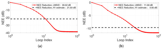 NEE reduction through the 100 iterations of the LMS system identification process and the final output NEE achieved by the H1 estimation model. (a) Purely linear plant. (b) Cubic nonlinear plant.