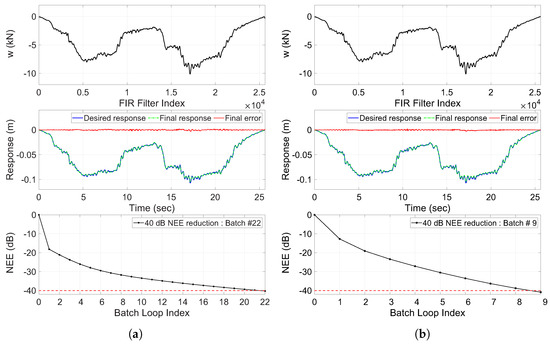 As can be seen, at the end of the simulation presented, the proposed method achieves a final response which is very close to the desired response with a low misadjustment, which, as defined by Widrow and Stearns [27], is a dimensionless measure of the excess mean square error caused by gradient estimation noise relative to the minimum mean square error produced by an optimal Weiner filter. Widrow and Walach [23] showed that misadjustment increases with an increase in the speed of adaptation and/or the number of filter coefficients. The parameters for both the proposed time-domain PT-Fx-LMS method and the conventional DFID process described in Section 4.1, with its results shown in Figure 6a, were tuned in order to achieve rapid reduction in NEE to reach the error threshold in the least number of iterations. In the DFID process, each simulated batch loop corresponds to a physical test on the SER test rig (‘Batch Loop index’ in the subsequent figures), and there is a strong desire to minimize the number of experimental tests in order to save time and money. Considering the least squares nature of the adaptive algorithm, the presence of measurement noise is known to only increase the final achievable misadjustment level and is not considered in these validation simulation test benches.