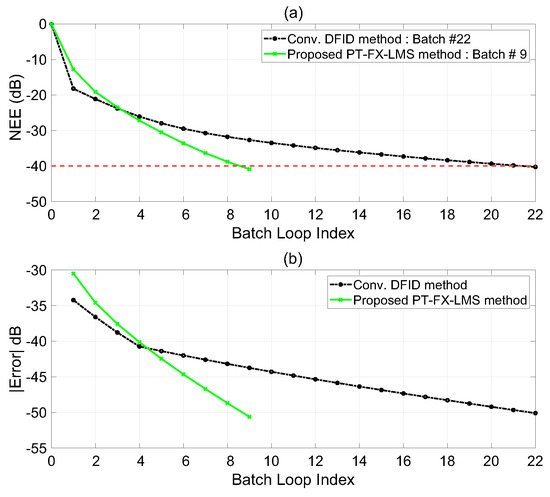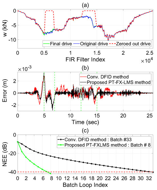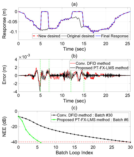 As can be seen from the results in Figure 9, the proposed PT-Fx-LMS algorithm returned to a solution with low misadjustment and without significantly affecting the response outside the intervals of interest after only nine batch loop iterations. The largest magnitude of errors, which are still an order of magnitude smaller than the response, were observed at the edges of the perturbation window without increasing the errors significantly outside these intervals. This clearly demonstrates that the response of the proposed method in one time interval is relatively independent of the response in another. It can also be seen in Figure 9b that the conventional DFID method yields larger magnitude errors even outside the bounds of the perturbed intervals (see time interval 7–10 s and 15–20 s) despite the adaptation for both methods starting from the same perturbed drive signal. The error energy comparison also shows that the proposed PT-Fx-LMS method descends to the threshold NEE much quicker using the same adaptation parameters as in Case Study 1.