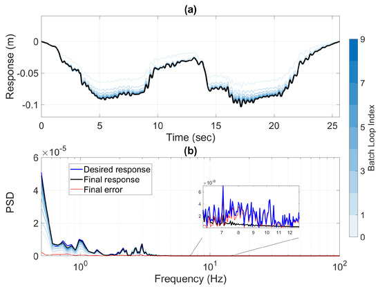 Figure 8a presents the progression of the response measured at the end of batch iteration in the time domain, and Figure 8b presents the similar progression using the power spectrum, computed using a window size of 8192 samples and 50% overlap. The least squares adaptive algorithm always targets the peaks in the spectrum first in order to drive the MSE to zero. The output response obtained from the final drive derived using the PT-Fx-LMS method converges to use most of the batch iterations to attenuate the error when the response is lower than the binding point of the nonlinear spring where the force curve exhibits the most stiffening property. In the spectrum, the actual response deviates the most from the target response in the 7–15 Hz range, which has a spectrum magnitude of at least 25 dB smaller than the peak for the model and target data considered in this study. Targeted improvements can be made by increasing the coherence of the identified model in the required frequency bands via excitation shaping during the system identification step.