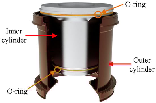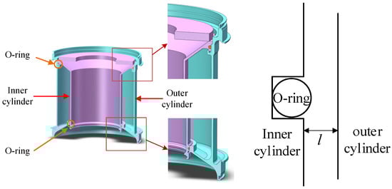 In this particular configuration of pulse solid rocket motor, the design of the lateral thrust mechanism primarily comprised an inner cylinder, an outer cylinder, and two O-ring seals, as illustrated in Figure 2. To uphold the reliability and accuracy of the system, the inner and outer cylinders of the lateral thrust apparatus were equipped with dual-layer spigots, with O-ring seals installed at the junctions to maintain hermetic integrity within the inner cavity and facilitate the requisite maneuverability of the spacecraft. The maximum deviation value between the inner and outer cylinders was 0.2 mm, and the minimum deviation value was 0 mm. The sum of the deviation values and l was 0.2 mm. Generally, after the initial positioning calibration, the inner and outer cylinders were aligned, and the inner cylinder was clamped with auxiliary fixtures and pressed into the outer cylinder. However, due to the inherent structure and system errors, the repeated assembly process may have easily caused damage to the O-ring between the inner and outer cylinders.