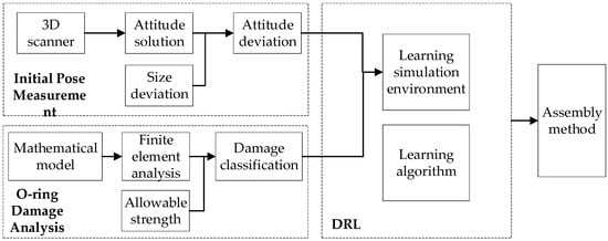 Additionally, during assembly, O-rings are in an invisible and difficult-to-measure state, making it challenging to reverse-engineer and analyze the assembly process. Given these challenges, this paper first uses finite element software to simulate the damage assembly parameters during the O-ring assembly process, summarizing and establishing the impact parameters of damage under different deformation conditions. Secondly, it measures the initial deviation and attitude position of the inner and outer cylinders before assembly, uses deep reinforcement learning (DRL) to plan the assembly path, and obtains high-precision assembly paths for the inner and outer cylinders under different initial attitudes. Finally, the feasibility of the assembly method is experimentally validated, providing a novel, efficient, and practical assembly technique for such high-precision assemblies.