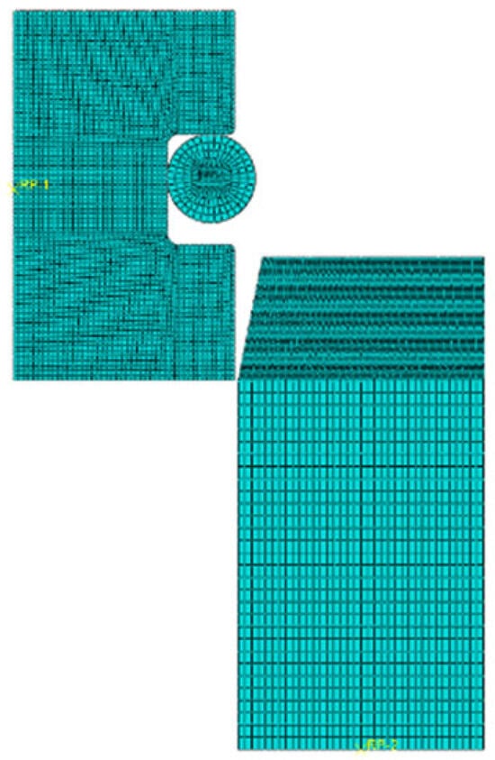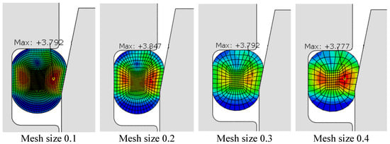 In the axisymmetric model, the mesh refinement level of the simulation software and the stress–strain relationship were analyzed. A Simulation Diagram of the O-Ring is shown in Figure 5. The adaptive meshing feature of the simulation software was used with different seed densities to divide the O-ring mesh into different levels of refinement. The maximum stress for different mesh sizes is shown in Figure 6. It can be observed that as the mesh was refined, the variation in the maximum contact stress was not significant. Therefore, the results obtained from the initial mesh division are reliable. In order to ensure the minimum value of the error and improve the calculation efficiency, the mesh size was selected as 0.3 mm. The grid division is shown in Figure 7. The grids adopted for the uneccentric and eccentric two-dimensional models in the following research will be consistent with the grids adopted this time.