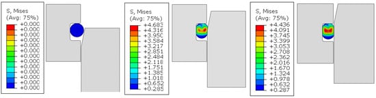 First, the assembly process of the O-ring was modeled and simulated. The material of the inner and outer cylinders was defined as steel, with an elastic modulus of 2.1 × 105 MPa, a Poisson’s ratio of 0.3, and a density of 7800 kg/m3. The density of the rubber was 1200 kg/m3. The assembly simulation process was defined, starting with the application of prescribed displacements and adjusting the assembly deviation values to simulate the influence of deviations on the assembly. The simulation of the O-ring assembly process assumed the following: