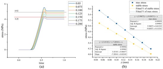 According to the strength calculations for O-rings in the reference literature, the shear strength follows a normal distribution [], and the factory-provided parameter manual specifies τ = 4.6 × 106 Mpa. To better align with expectations, we assumed that the shear strength of the O-ring followed a normal distribution (μτ = 4.6 × 106, στ = 3.2 × 105). This information can be used as a reference in conjunction with the model results. Therefore, in this study, a stress greater than 4.3 × 106 Mpa was considered as failure. By simulating the assembly l of the O-ring between the inner and outer cylinders, the value range was 0.05 mm–0.20 mm, and a series of stress curves were obtained. According to the normal distribution, when the stress value of the O-ring was greater than 4.92 × 106 Mpa, there is an 84.1344% probability of damage, so we can consider it to have been damaged. Due to the linear relationship between stress value and l, we can also assume that the probability of damage was linearly distributed with the stress value when the stress value was less than 4.92 × 106 Mpa. The relationship between the assembly process and the stress of different l values is shown in Figure 9a. The maximum stress value and stable stress value both have a linear relationship with l, which is shown in Figure 9b. The sum of the deviation values-db and l is 0.2 mm. Therefore, the damage of O-ring is related to the deviation value. So, there exists a linear relationship between db and assembly stress. Subsequently, we established a reward function for deep reinforcement learning based on the range value of db.