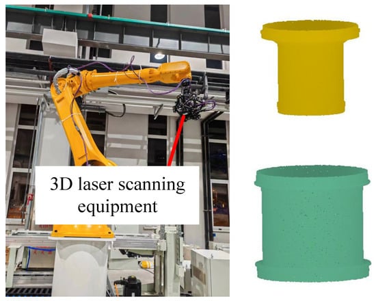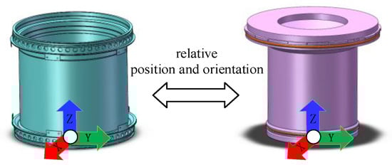 Due to the precision of assembly and the influence of auxiliary fixtures and assembly equipment, the relative spatial posture of the inner and outer cylinders during assembly docking was random. Since spatial orientation errors have randomness, 3D laser scanning equipment was used to directly measure the spatial orientation of the inner and outer cylinders. A point cloud map of the inner and outer cylinders is shown in Figure 10. When docking the assembly, the relative spatial orientation of the inner and outer cylinders was random. Therefore, to determine the orientation information of the inner and outer cylinders in space, it was necessary to first determine the extraction of the spatial coordinate information of the inner and outer cylinders. The surface features involved in this device can be classified as cylindrical features, so the collected data can be fitted to cylinders. Based on the transformation relationship between the measurement coordinate system and the cylindrical coordinate system, as well as the cylinder radius, the orientation of the cylinder can be determined []. The relationship between the measuring coordinate system and the cylindrical coordinate system is shown in Figure 11.