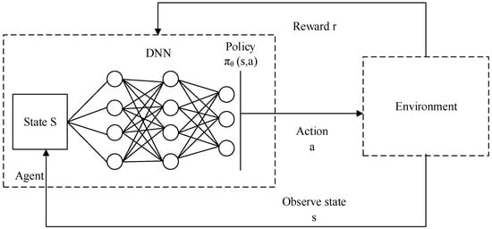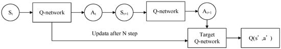 Deep Q-Learning (DQN) combined the perceptual capabilities of deep learning with the decision-making capabilities of reinforcement learning. By interacting with the environment, it used a deep neural network to extract abstract representations of data and then performs reinforcement learning based on these representations to optimize decision-making strategies. DQN not only has the strong feature learning capabilities of deep learning but also the strong decision-making capabilities of reinforcement learning, giving it tremendous potential []. The DQN status update is shown in Figure 13.