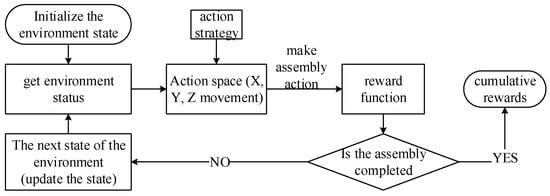 DRL, as an emerging technology, is widely applied in various industries. Some researchers have applied DRL to peg-and-hole assembly path planning. Chang et al. treated the assembly robot as an intelligent agent and defined a discrete three-dimensional space as the state space, using each discrete position point and specific x, y, z angles as action states, thus establishing an assembly reinforcement learning environment []. Beltran-Hernandez et al. proposed a learning framework for position-controlled robot manipulators to solve contact-rich manipulation tasks [].