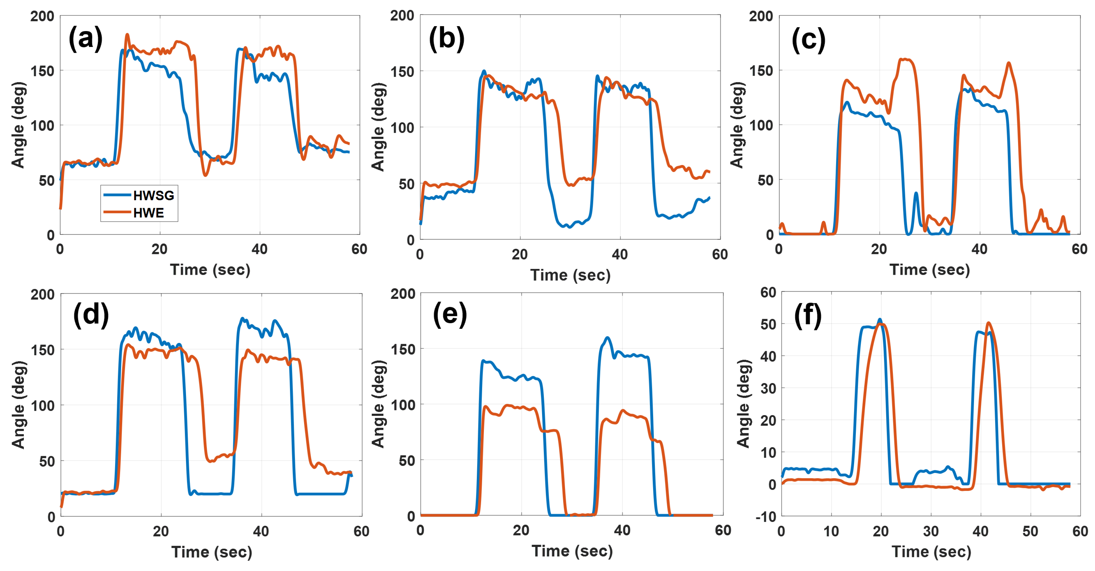 - Qualitatively, the graphs demonstrate that the fingers and wrist joints assisted by HWE followed the same trajectories as guided by the HWSG, which verifies the functionality of the bilateral therapy algorithm.
