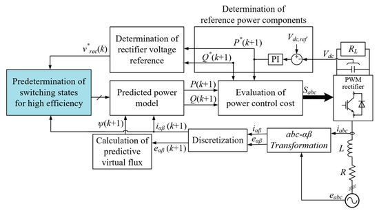 The overall architecture of the proposed MPVFDPC with switching state predetermination is depicted in Figure 4. The three-phase input currents and voltages are measured with current and voltage sensors. The currents and voltages are transformed from the abc frame to the αβ frame to convert three quantities with a 120° phase shift with respect to each other to two quantities with a 90° phase shift with respect to each other, which can simplify calculations related to controller design. The current and voltage signals in the αβ frame are discretized from continuous domain to discrete domain. In addition, the predictive virtual flux in the next instant, which is used to predict the future power elements, is obtained based on the source voltage in the αβ frame. On the other hand, the reference of the real power reference can be achieved by the regulation of the PI controller for the dc-link voltage of the converter. The unity power operation is guaranteed by setting the reactive power reference to zero. Those power element references are used to determine the rectifier voltage reference using the relationship between voltage and power components. Next, according to the rectifier voltage reference along with the input current signals, the switching states that will be used for high efficiency can be predetermined at every step, as shown in Table 1. Only the predetermined switching states are employed for the next-step operation, which guarantees low switching losses and highly efficient converter operation. The predictive active and reactive power are determined using (7) in the following manner: