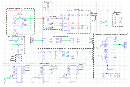 Simulation and experimentation are achieved to verify the developed scheme’s dynamic as well as steady-state performance. The distorted grid voltage state is generated by injecting seventh-order harmonic components into one phase of the grid voltage, and then the operation of the PWM rectifier is investigated as well. Additionally, the developed MPVFDPC is compared to Conv. MPDPC [9] and Conv. MPVFDPC, which is employed by applying the same virtual flux estimation as in the proposed approach. In the simulation, the circuit simulator, PSIM, was used. The schematic of the PWM rectifier model and the function of each block are specified in Figure 5. The main parameters for the simulation and experiment are illustrated in Table 2.