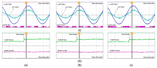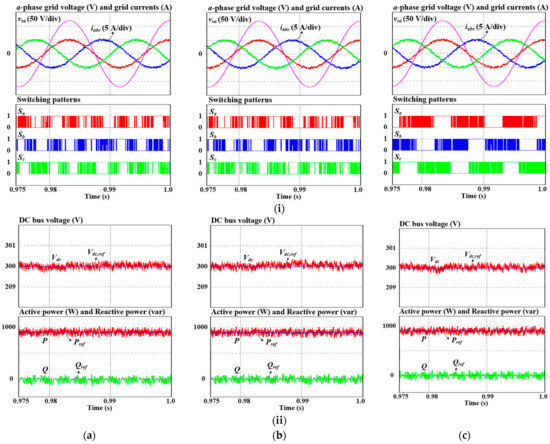 In order to verify the dynamic experimental performance of the developed approach, the active power reference is increased from 600 W to 900 W in Figure 12. It is evident that the waveform of a-phase grid current acquired by three control schemes can quickly track the change in reference active power without overshooting. In channel (ii) of Figure 12, it shows that active and reactive powers respond fast to the change of reference. The dynamics of the developed MPVFDPC method are comparable to conventional approaches. Furthermore, the developed MPVFDPC approach correctly generates clamping regions even during dynamic performance, as can be seen from the a-phase switching pattern.