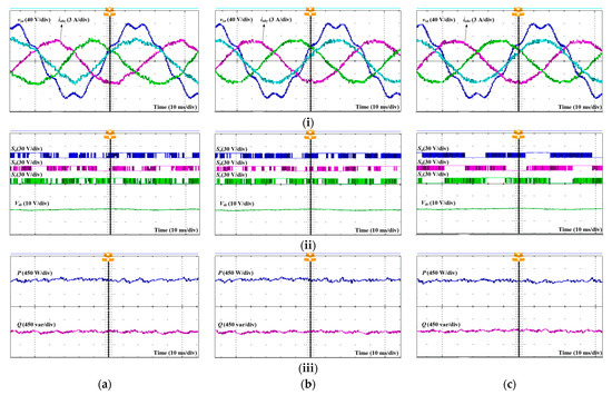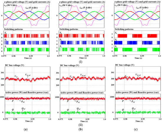 Figure 7 shows the steady-state simulation waveforms of the PWM rectifier under the distorted grid voltage state obtained by three control schemes. The 10% seventh-order harmonic component is imposed on the a-phase grid voltage. Then, as depicted in Figure 7a, the grid currents produced by the Conv. MPDPC are distorted. Meanwhile, the grid currents acquired by Conv. MPVFDPC and proposed MPVFDPC are kept in sinusoidal form due to the implementation of virtual flux control. As observed in the presence of distorted grid voltage, the unity power factor operation is sustained. Furthermore, the patterns of the switch operation derived by the developed MPVFDPC approach comprise non-switching regions corresponding to one-third of the fundamental period, as shown in Figure 7c. These non-switching periods occur in the vicinity of the maximum of grid currents, even with grid voltage distortion. In channel (ii) of Figure 7, the DC bus voltage, active power, and reactive power follow accurately the corresponding references, but the DC bus voltage produced by the Conv. MPDPC has a slightly higher ripple than the two remaining approaches.