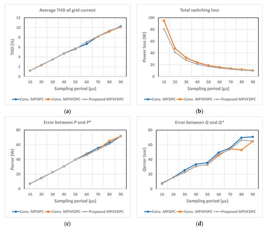 Performance comparison between Conv. MPDPC, Conv. MPVFDPC, and proposed MPVFDPC under variation of sampling period: (a) Average THD of grid current, (b) Total switching loss, (c) Error between active power and reference active power, (d) Error between reactive power and reference reactive power.