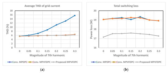 Figure 14a–d show a quantitative comparison between three control schemes following the rise of the added seventh-order harmonics. In Figure 14a, the average THD obtained by Conv. MPDPC significantly increases following the rise of the magnitude of the seventh-order harmonic component. At 30% injection of the seventh-order harmonic component, the average THD increases by about 2.8 times compared to the ideal state. Meanwhile, because of the implementation of virtual flux control, the average THD obtained by Conv. MPVFDPC and proposed MPVFDPC approaches slightly increase when the magnitude of the seventh-order harmonic component rises. Regarding total switching loss, it is clearly observed in Figure 14b that the total switching loss from the developed MPVFDPC is decreased in comparison with the two remaining approaches under different magnitudes of the injected seventh-order harmonic component. This difference is about 10%. Meanwhile, both the error between active power and reference active power and the error between reactive power and reference reactive power obtained by Conv. MPDPC are higher than those of the proposed MPVFDPC approach.