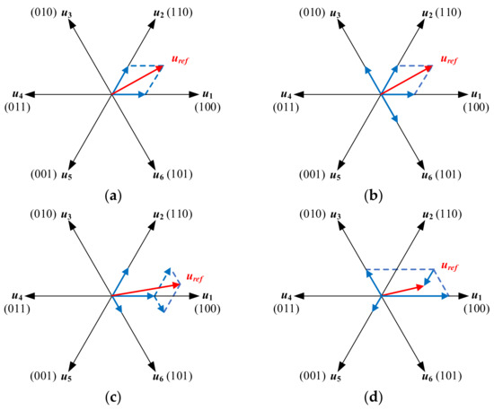 To avoid increasing hardware costs, improving the traditional SVPWM modulation scheme shown in Figure 1a has become a better choice [7]. Reference [8] indicates that the CMV in the zero voltage vector (ZVV) state is half of the DC-link voltage and is three times that in the active voltage vector (AVV) state, so changing the vector synthesis scheme by reducing or eliminating the dwell time of ZVV is an effective way to reduce CMV. The CMV suppression scheme is divided into SVPWM and carrier-based PWM schemes [9,10,11,12]. It mainly includes active zero-state PWM (AZSPWM), near-state PWM (NSPWM), and remote-state PWM (RSPWM). AZSPWM adopts two adjacent basic voltage vectors (VVs) and two opposite AVVs to replace the ZVV, as shown in Figure 1b; because it involves four VVs synthesizing the reference VV, the high-frequency CMV can be effectively reduced, but the resulting current harmonic is big. NSPWM adopts three adjacent AVVs to synthesize the reference VV, as shown in Figure 1c; it can reduce the high- and low-frequency CMV. Meanwhile, the switching is small. However, NSPWM is only suitable for the HVMR. If the reference is located in the LVMR, the ZVV will inevitably be introduced. At this time, the CMV magnitude is greater than that for AZSPWM applied in the LVMR. RSPWM1 and RSPWM2 adopt three even VVs and three odd VVs, in Figure 1d, respectively, to synthesize the reference VV. However, the maximum linear modulation region of these two is small. Furthermore, RSPWM3 can reduce high-frequency CMV by adopting mixed three even VVs and three odd VVs, achieving a wider modulation range. However, RSPWM3 still cannot cover the whole modulation region [13]. In [14,15], the impact of dead time on CMV is analyzed. To reduce the harmonic distortion of the current, an MPC scheme is proposed to use the six AVVs fully. However, the improvement effect is limited to situations with little dead time.